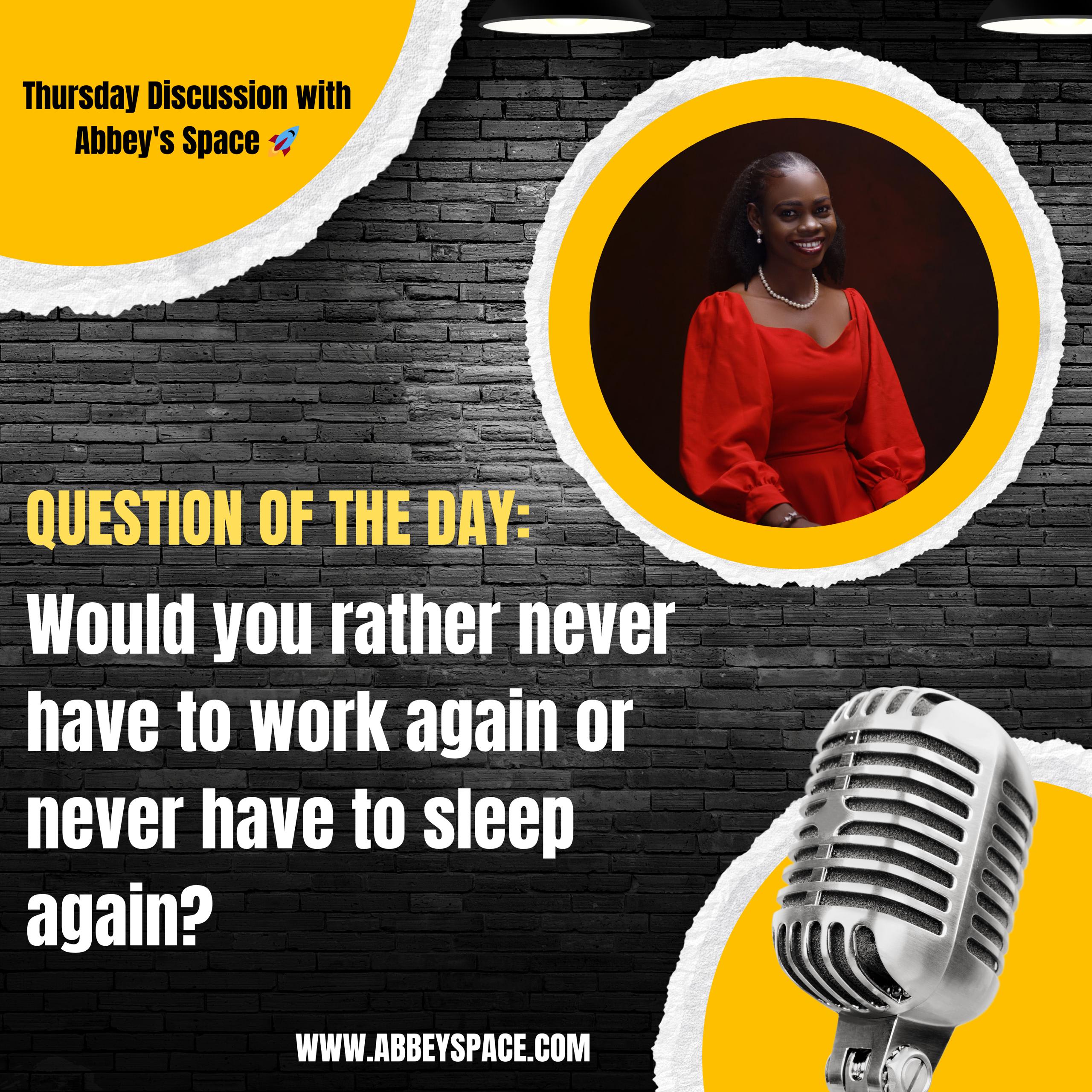 It's another Thursday Discussion with Abbey's Space ๐. Like, comment, share and vote on the poll. Thank You โค Poll Vote in this poll: Never have to work again Never have to sleep again 18 Responses Comments What do you think? 11 Responses ๐ 6 Upvote ๐ 1 Funny ๐ 4 Love ๐ฎ 0 Surprised ๐ก 0 Angry ๐ข 0 Sad Share your thoughts Comment Loading comments... Loading comments...