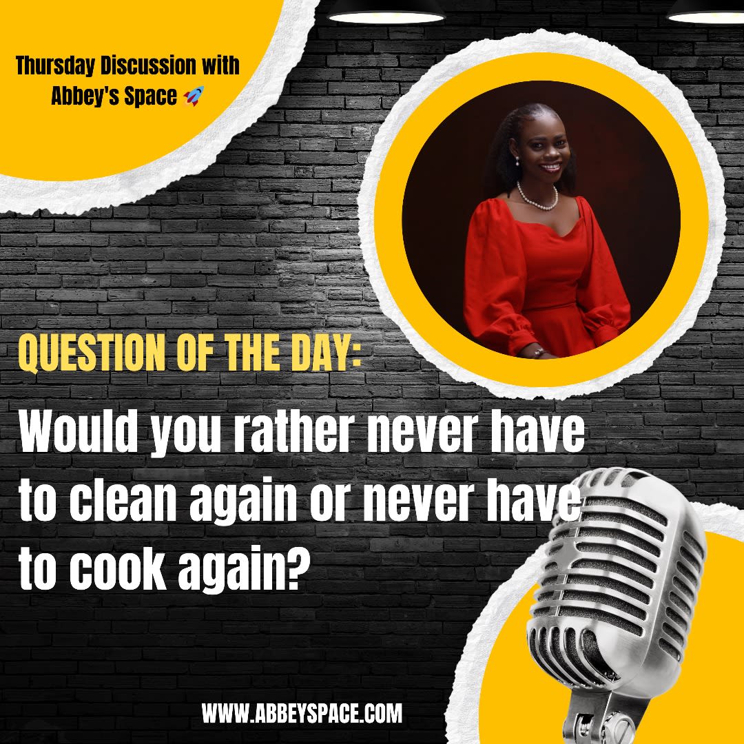 Do well to vote on the poll, like, comment, and share. Thank You โค๏ธ #thursdaydiscussion #abbeyspace Poll Vote in this poll: Never have to clean again Never have to cook again 9 Responses Comments What do you think? 9 Responses ๐ 6 Upvote ๐ 1 Funny ๐ 2 Love ๐ฎ 0 Surprised ๐ก 0 Angry ๐ข 0 Sad Share your thoughts Comment Loading comments... Loading comments...